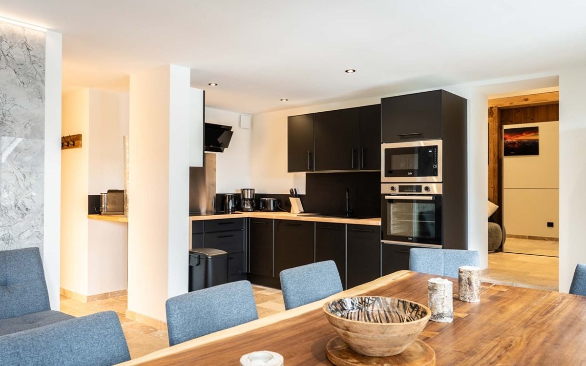 Appartement avec salle à manger conviviale pour les repas après-ski. 5 suites parentales et sauna